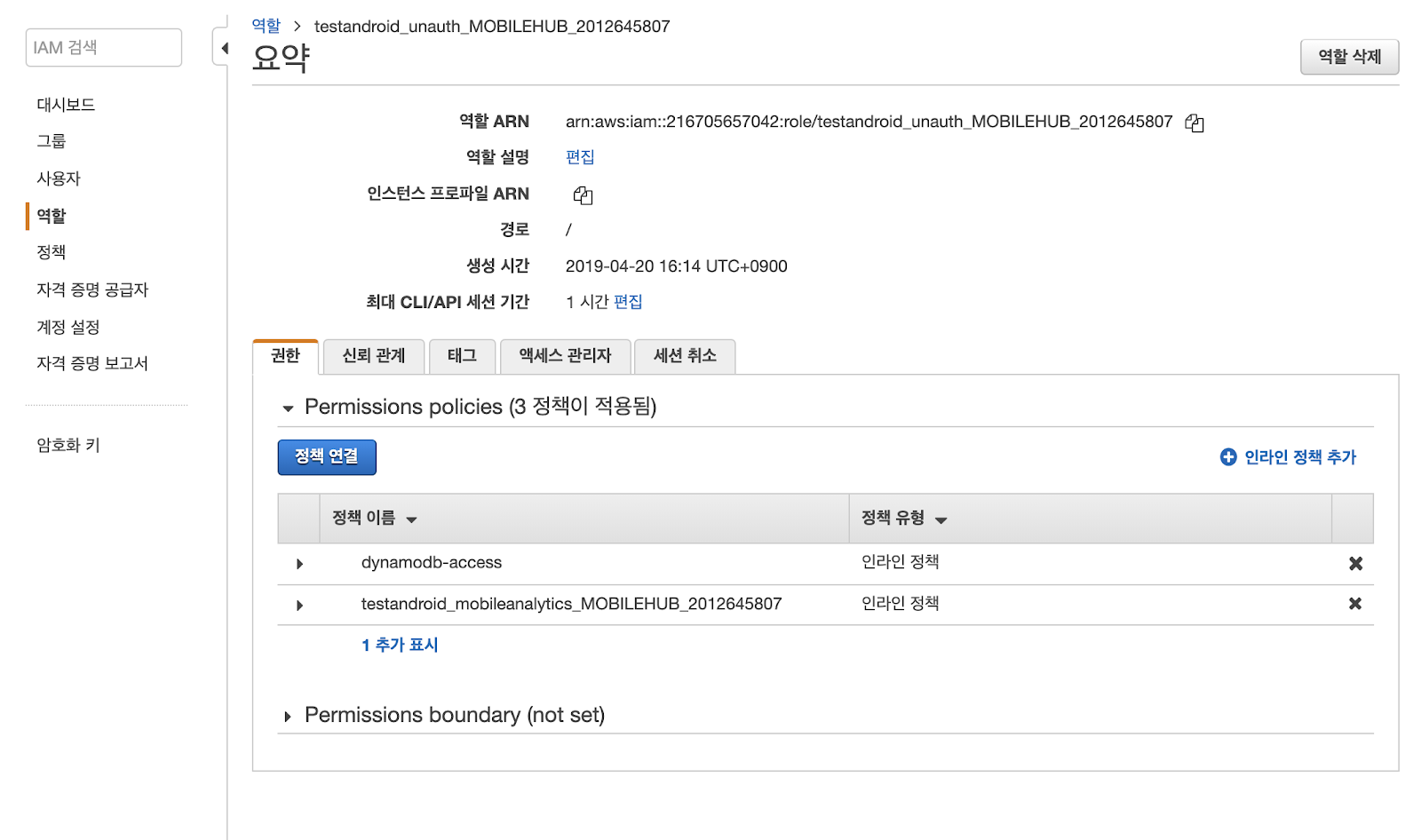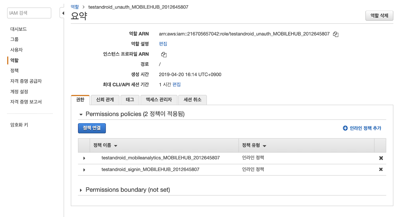 Android Mobile Hub에서 생성한 프로젝트의 이름에 unauth라고 생긴 role을 클릭합니다.