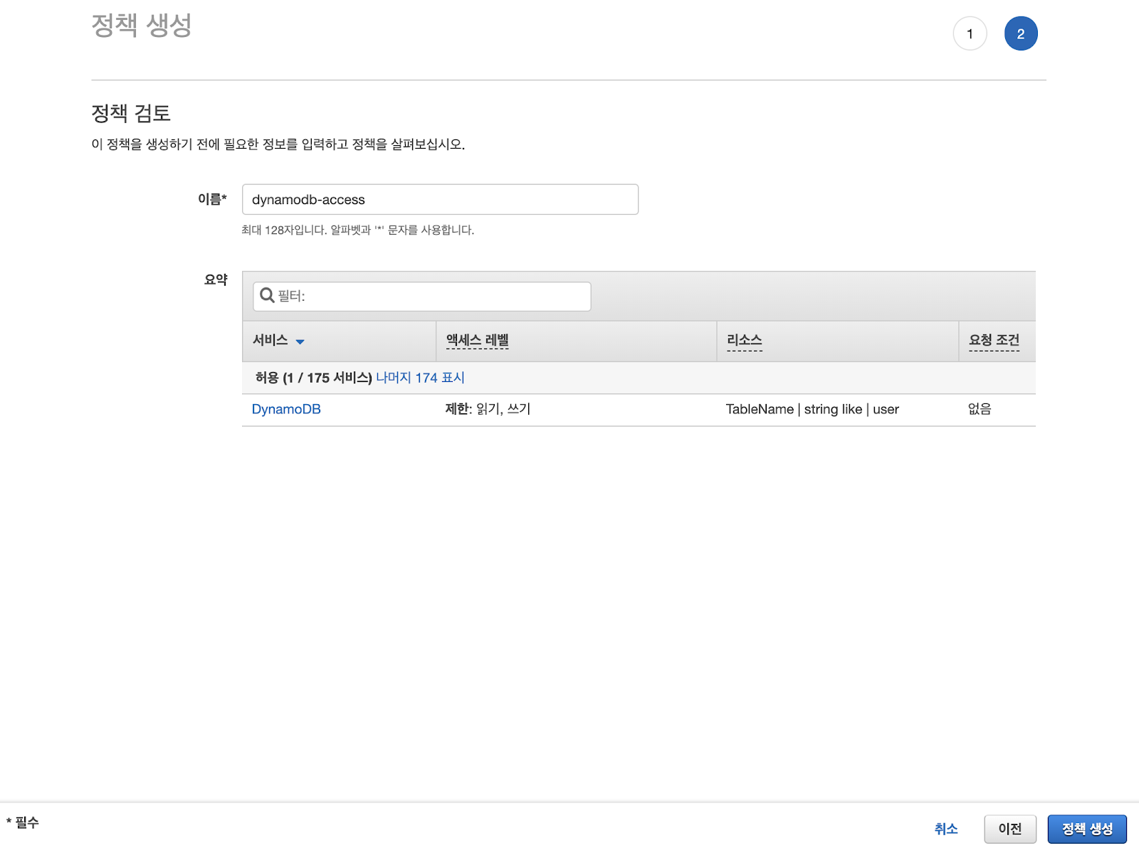 정책 이름을 넣고 정책 생성 버튼을 클릭합니다.