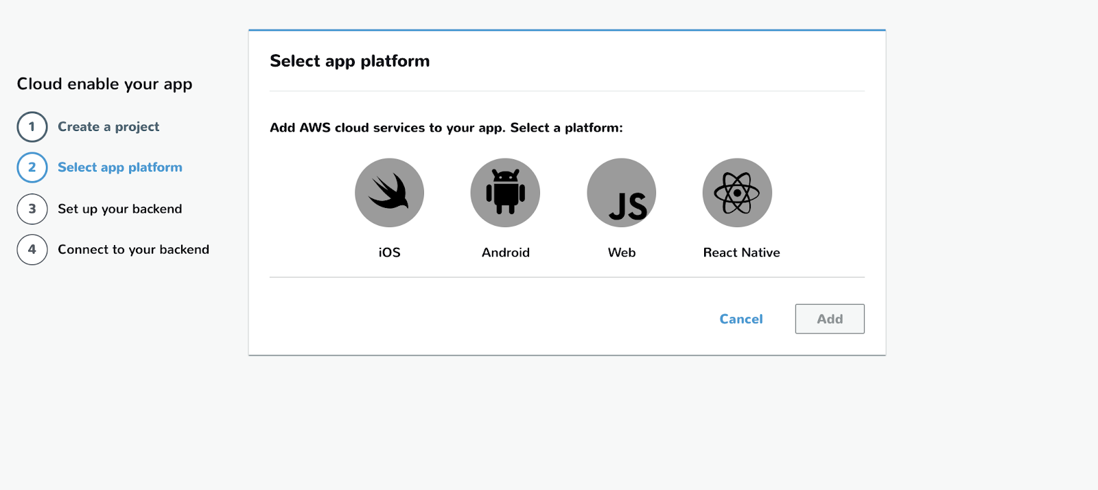 앱의 플랫폼 android을 선택하고 Add 버튼을 클릭합니다.