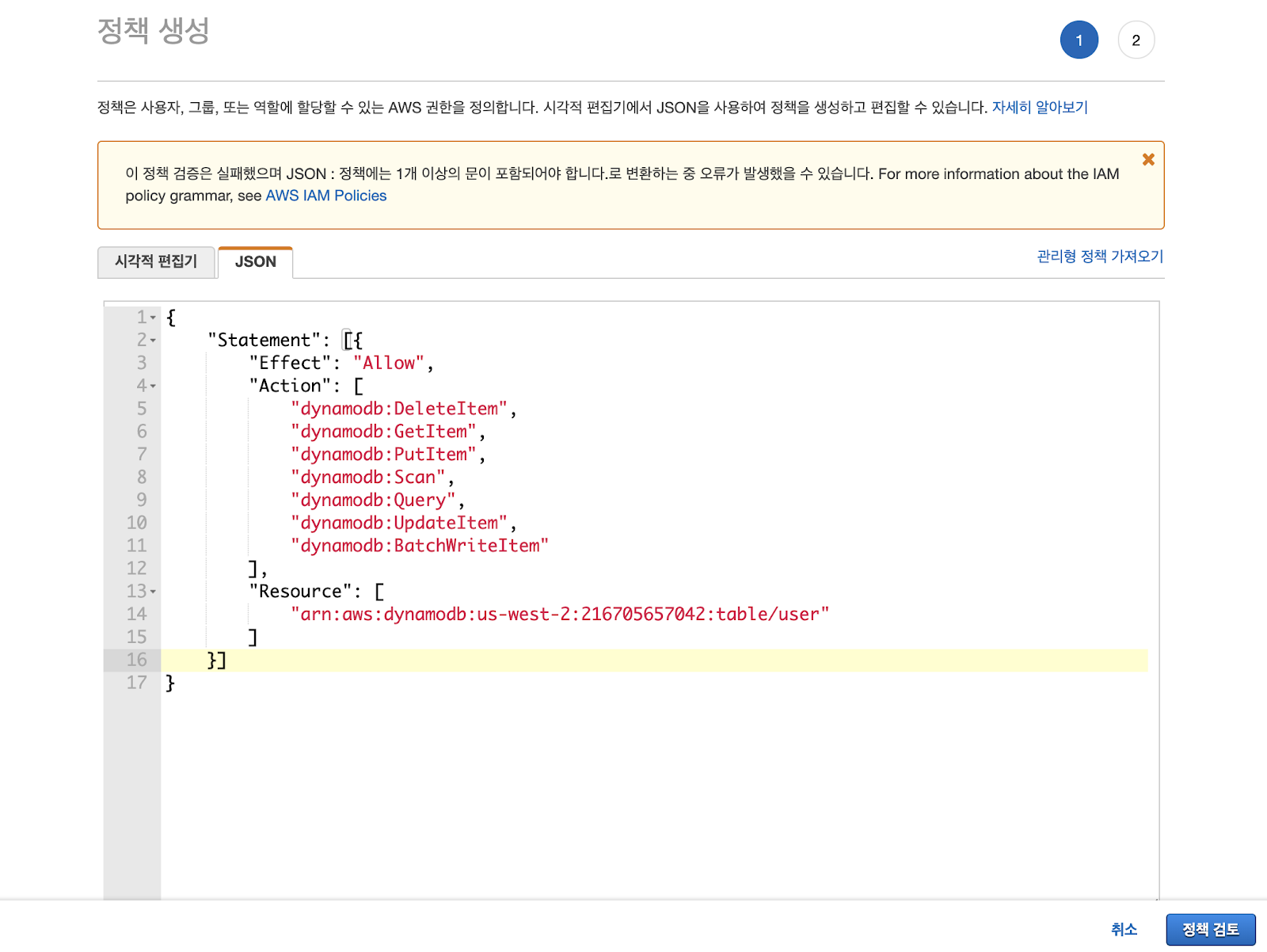 이 때 Resource의 ARN에서 dynamoDB의 ARN을 넣으셔야 합니다.