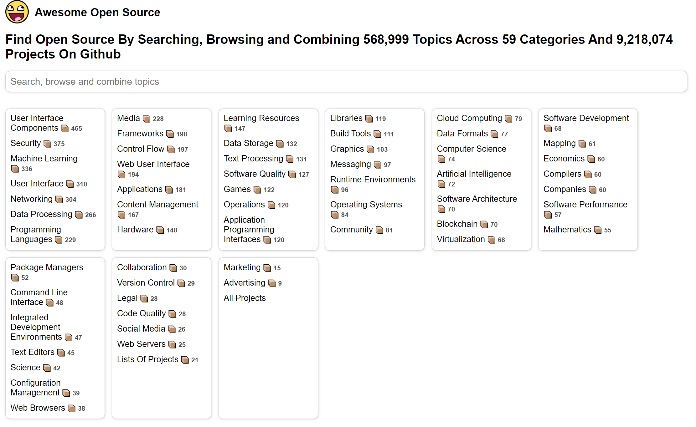 깃허브는 어마어마하게 많은 소스들이 있지만 완성도가 높은 소스들을 찾기는 결코 쉽지 않습니다. Awesome Open Source 사이트는 이러한 문제점을 해결하고자 깃허브의 많은 오픈소스 중 완성도가 높은 것들만 정리해둔 사이트입니다. 각각의 기술별로 목록 형태로 잘 분류되어 있습니다.