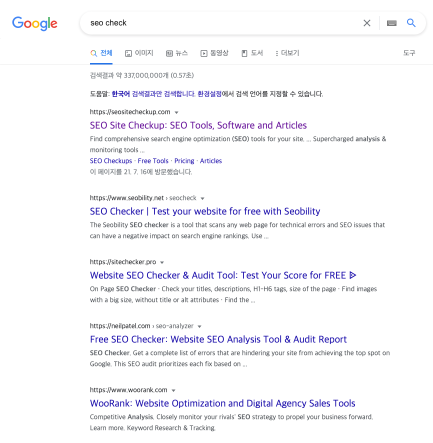 아래 SEO Checker 들은 해당 회사들의 기준과 노하우에 의해 만들어졌으므로 같은 웹사이트를 넣어도 각 SEO Checker마다 다르게 나타날 수 있습니다. 하지만 웹사이트를 개선해야 하는 기준들은 다 비슷하므로 자신이 보기에 편리한 SEO Checker를 선택해서 사용하시면 됩니다.