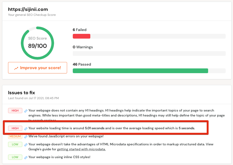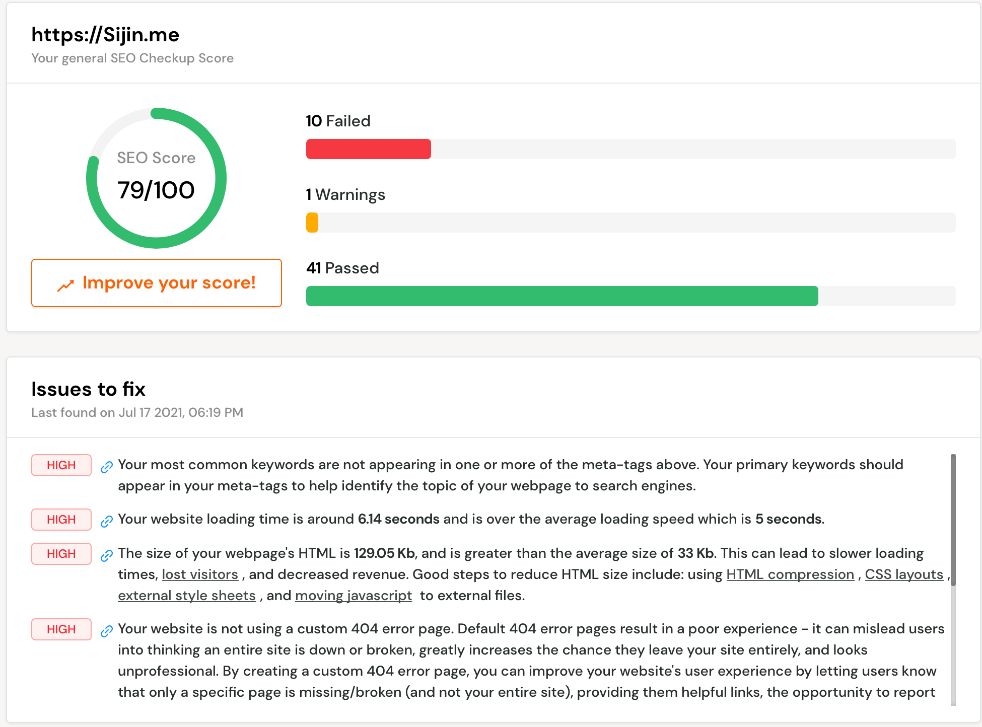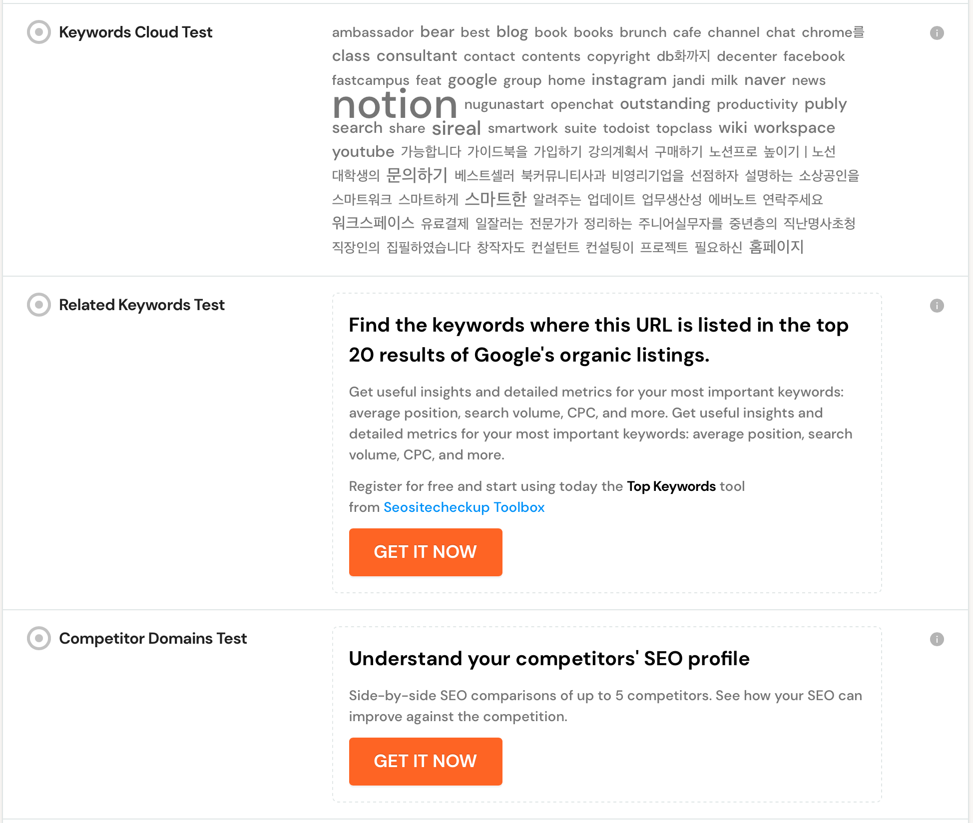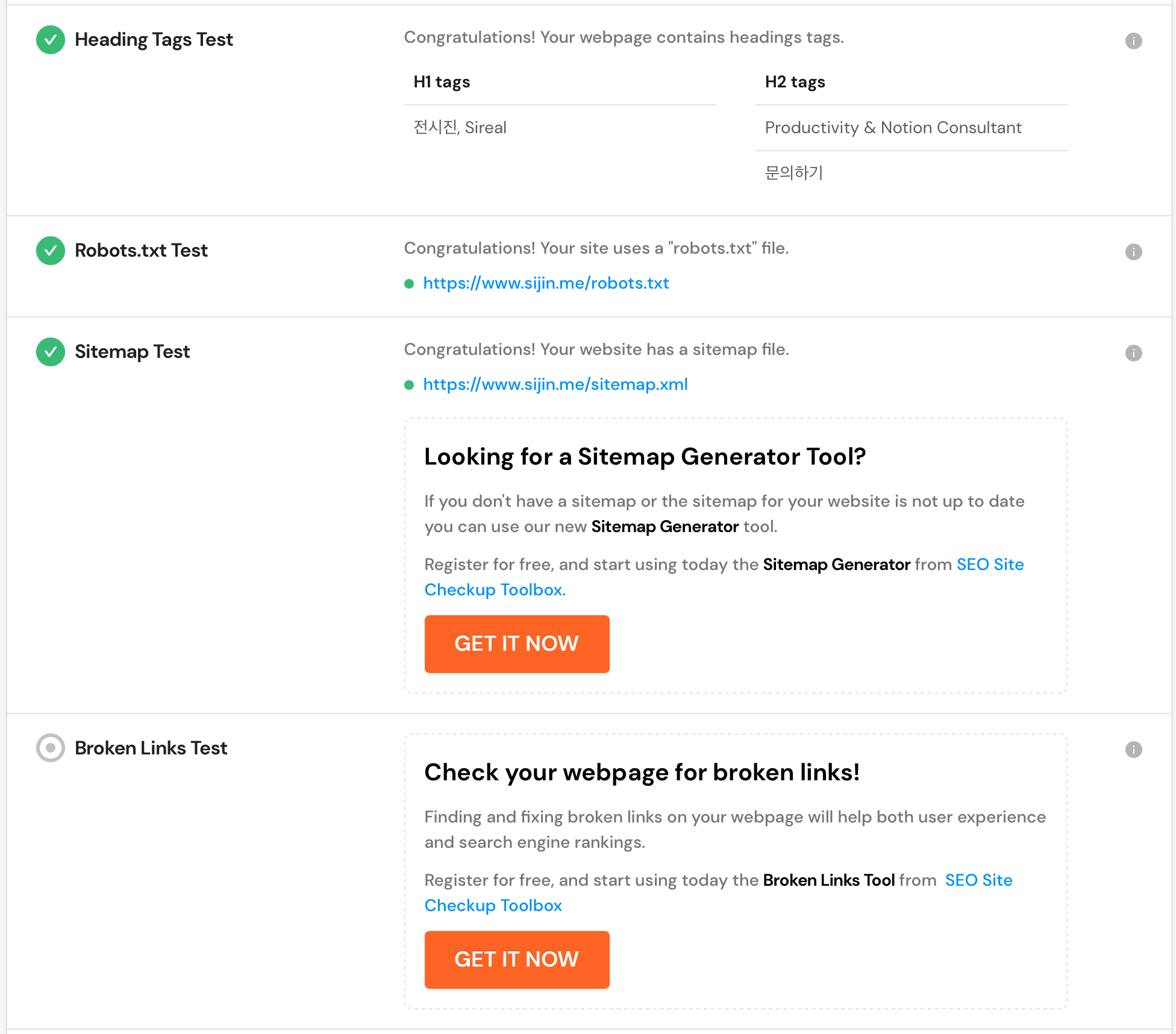 SEO Checker 사이트를 여러곳 써보았지만 이 사이트가 조금 더 자세히 알려주는 것 같습니다. 영어가 어려우면 번역기를 돌리면 되니 전혀 문제가 없습니다. 가끔 번역기를 돌려도 이게 무슨 말인지, 어디를 개선해야 하는지 모를 때가 있는데, 그 때는 사내 개발자분에게 물어보시면 도움 받을 수 있을 것입니다.