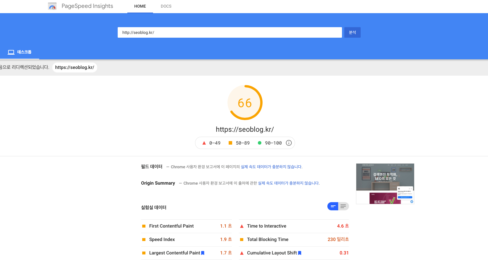 데스크탑 기준 페이지 속도는 66점으로 개선이 필요합니다. 국내 웹사이트에서 66점이면 꽤 높은 편이라는 카더라를 들은적이 있습니다. 이미지 맨 아래 실험실 데이터에서 어떤 점을 개선하면 얼마나 빨라지는지 확인할 수 ㅣㅇㅆ고,