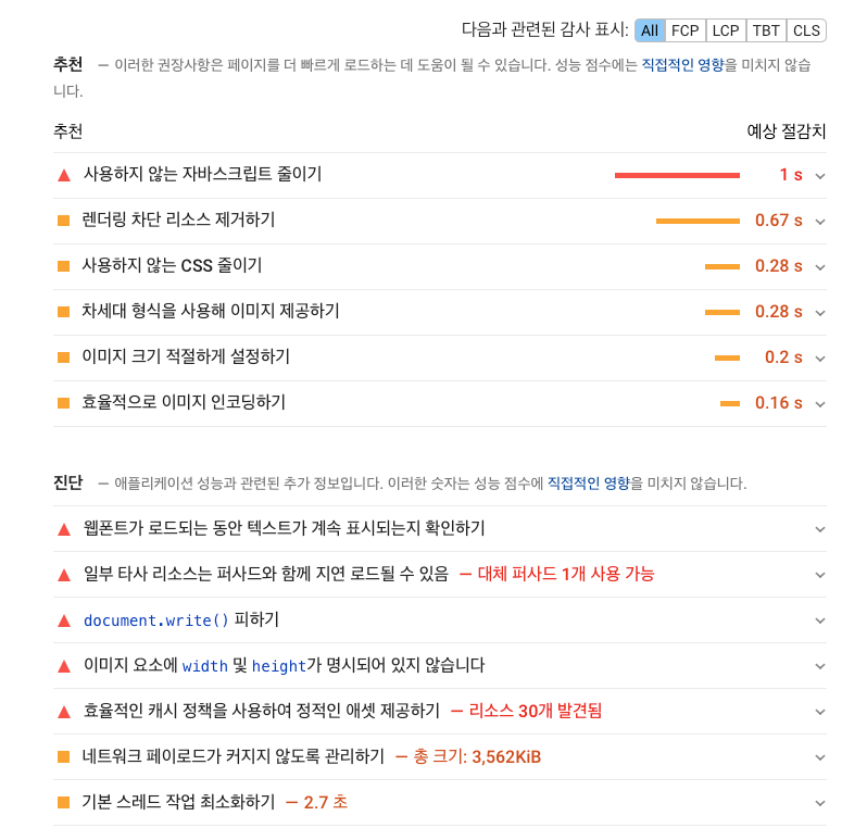 그 아래로 내려가면 어떤 점을 고쳐야 하는지 자세히 살펴볼 수 있습니다. 이를 통해 개발자와 상의하여 웹사이트의 속도를 개선시킬 수 있죠.