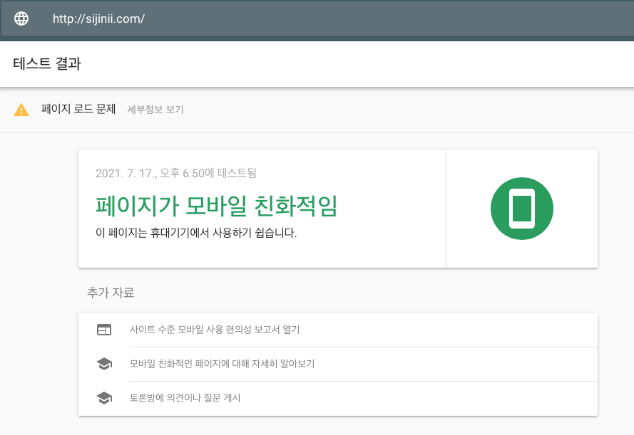 페이지 로드에 문제가 있긴 하지만 페이지가 모바일 친화적이라고 나타납니다.