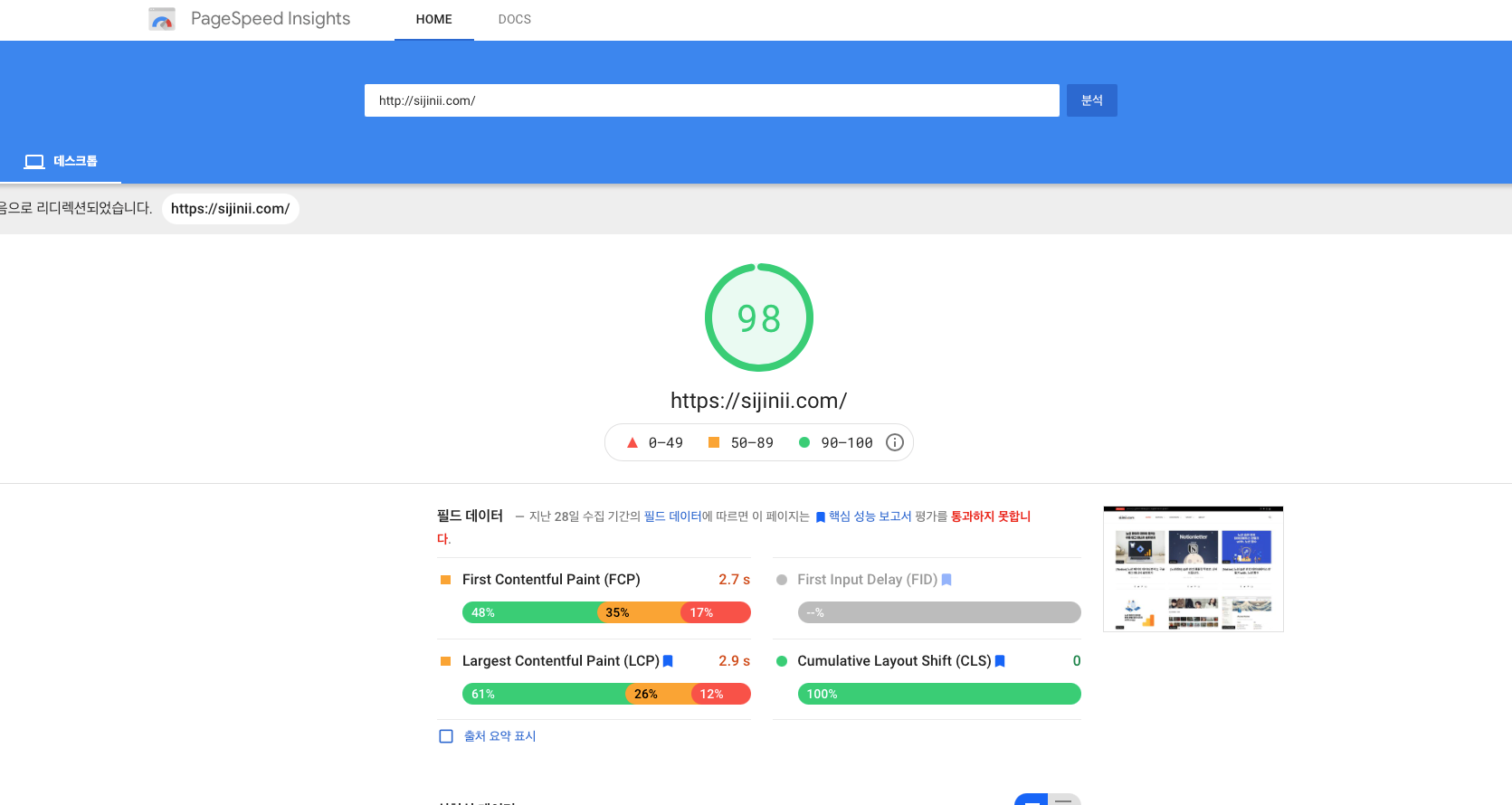 sijinii.com 사이트의 페이지 속도는 98점인데, 평균 페이지 로딩 속도가 느리다고 하는 걸 보니 모바일 로딩 속도 기준이 아닐까? 하는 생각이 듭니다. (모바일은 점수가 49점입니다.)